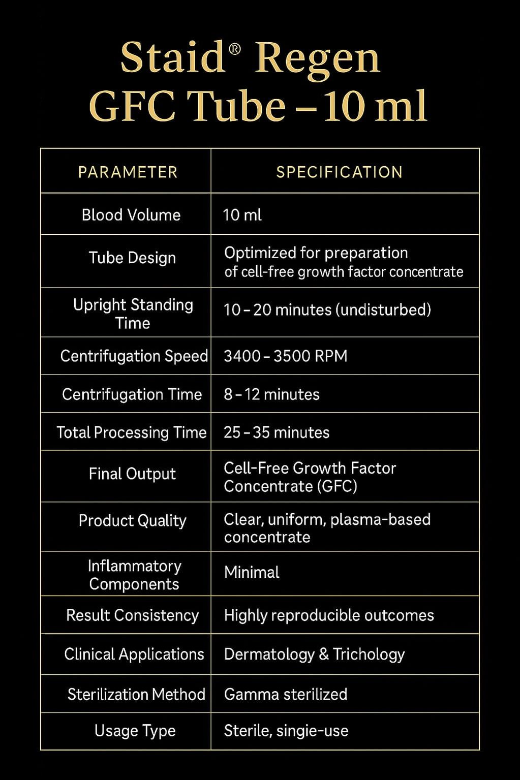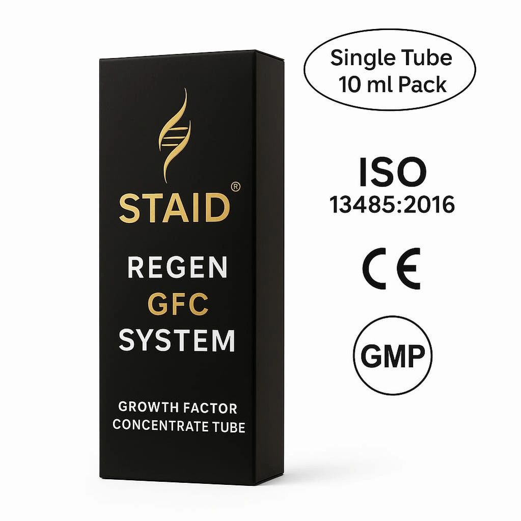 Staid® Regen GFC Tube is a premium Growth Factor Concentrate (GFC) tube designed for consistent, cell-free growth factor preparation. Manufactured under stringent quality standards, our 10 ml GFC tube is widely used by dermatology and trichology clinics across India, including Delhi NCR, for advanced regenerative procedures.