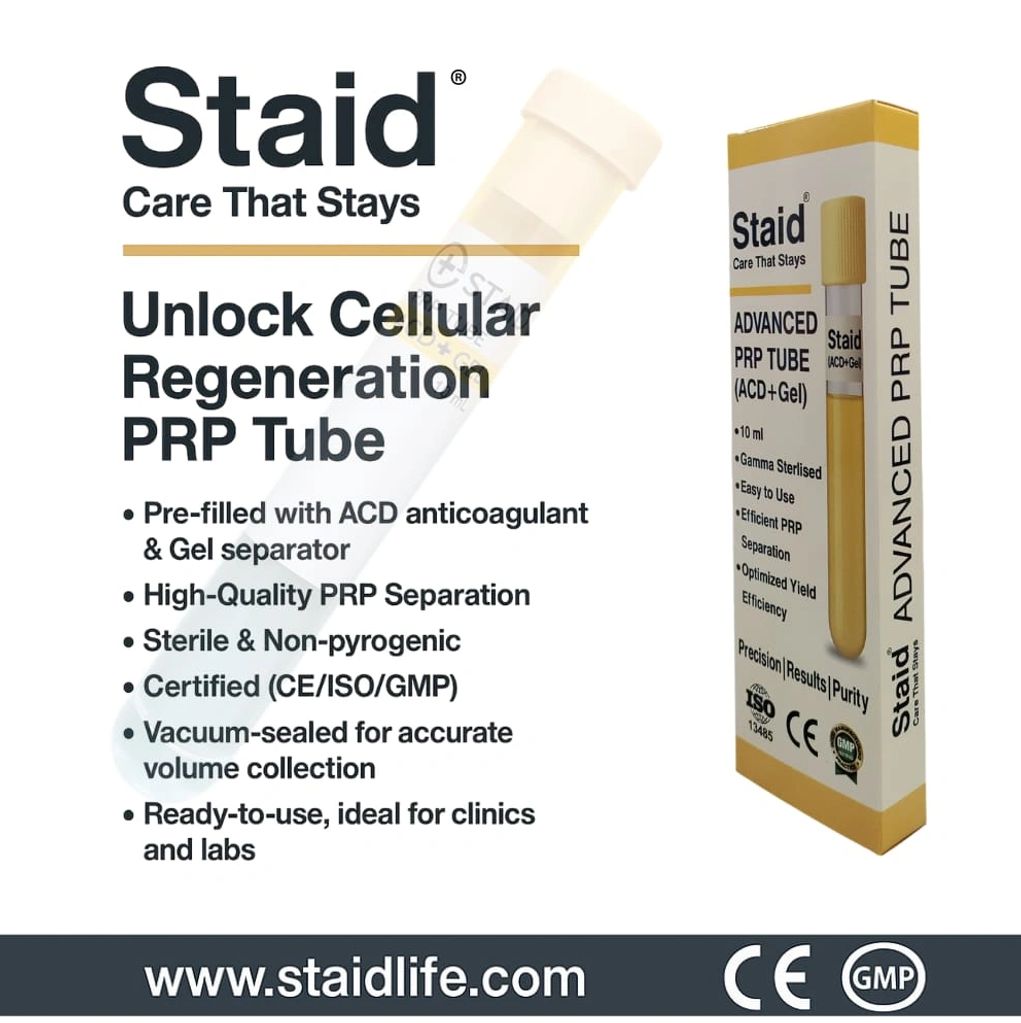 Staid® Advanced PRP Tube is a premium 10 ml PRP tube with ACD + Gel, designed for efficient separation of Platelet-Rich Plasma (PRP). Manufactured for consistent platelet yield and clinical reliability, it is widely used by dermatology, trichology, regenerative application and aesthetic clinics across India.